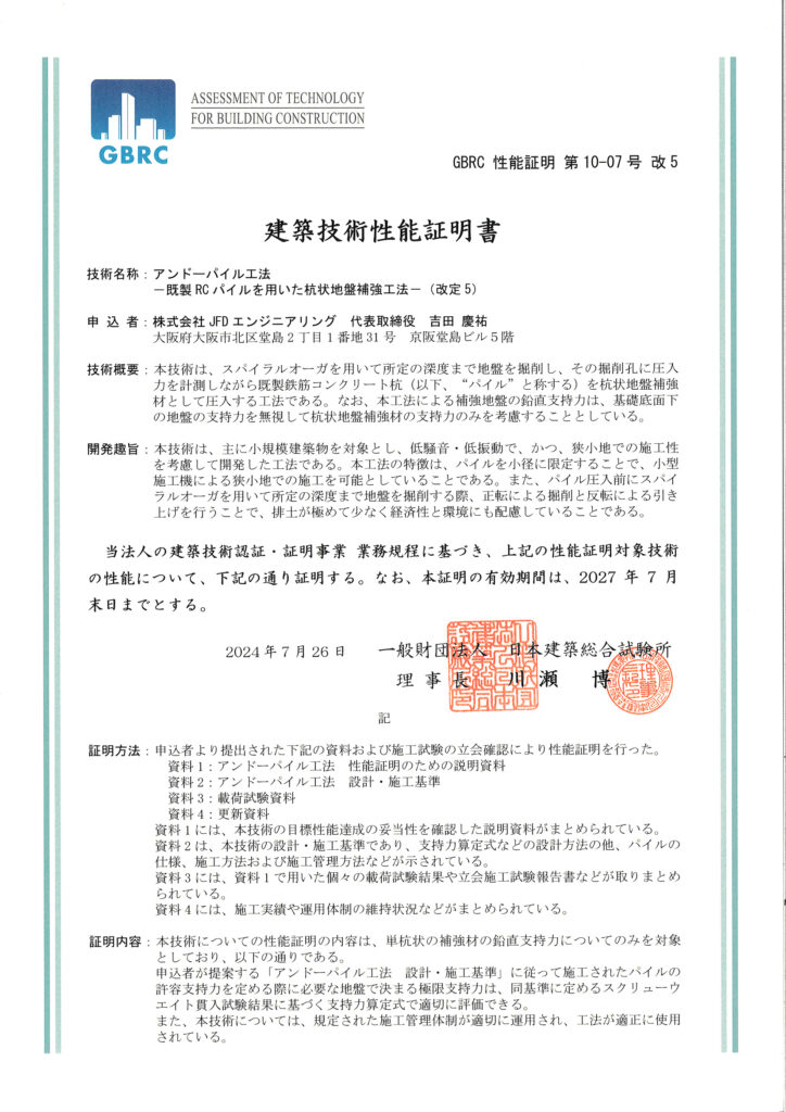 アンドーパイル工法は、一般社団法人 日本建築総合試験所の建築技術性能証明を取得しております。(2010年6月取得)